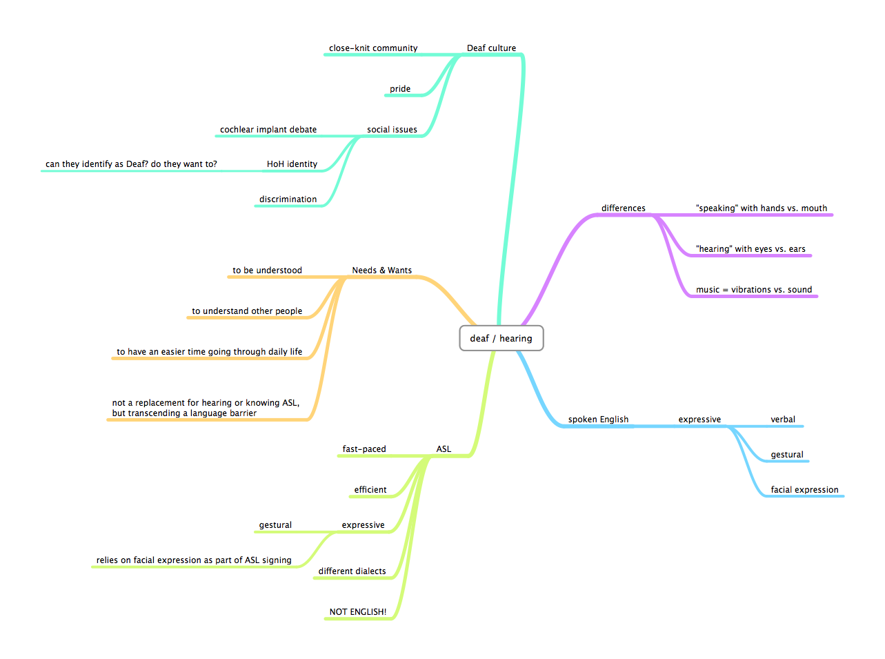 - One-on-one: Once a conversation gets started, there are dialog boxes that display the text that has been transcribed. Emoticons (or whatever visual language I decide on [color, typography, etc.] ) will also be shown in context. Each speech bubble is directional; the user on each side of the device sees the transcription correctly.